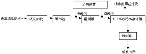 對再生造紙廢水處理的沉淀效率、紙漿回用等幾個(gè)方面的考慮,以達(dá)到排放標(biāo)準(zhǔn)目的,典型工藝流程如下: