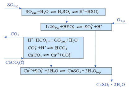 要該工藝主反應(yīng)為煙氣中的SO2先溶解于吸收漿液中,并離解成H+和SO32-(HSO3-)然后向液體相擴(kuò)散。同時(shí),在吸收塔底部的吸收氧化槽,CaCO3在酸性環(huán)境下溶解,生成Ca2+和HCO3-(CO32-),鼓入足夠的空氣將SO32-(HSO3-)強(qiáng)制氧化成SO42-,并最終生成(CaSO4·2H2O),主要過程反應(yīng)過程式如下: