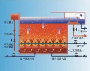 采用氣水平行上向流,使空間過濾能被更好的運用,空氣能將固體物質(zhì)帶入濾床深處,在濾池中能得到高負荷、均勻的固體物質(zhì),從而延長了反沖洗周期,減少清洗時間和清洗時用的氣水量;
