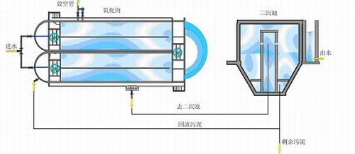 氧化溝由多條封閉的溝組成,建成環(huán)狀,大量的微生物隨污水在其中循環(huán)流動,從前一系統(tǒng)進入的原水迅速被溝內(nèi)的水流稀釋,混合并隨之流動。這種溝型具備推流式和完全混合式的雙重特點。工藝設計上取消了初沉池,氧化溝內(nèi)有機物徹底降解并發(fā)生硝化反應;如果沿環(huán)形池水流方向改變曝氣強度,可形成缺氧段,進行反硝化反應;加長污泥泥齡,可取消污泥消化池,簡化污泥的處理工藝;加大二沉池,保證泥水分離效果;在氧化溝前加設厭氧池,可達到除磷的要求。氧化溝出水進入二沉池進行泥水分離,微生物沉淀到池底,一部分回流入氧化溝,另一部分進入儲泥池進行污泥處理,上清液通過溢流堰出水,經(jīng)過消毒后,出水可達到相關標準。