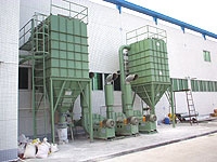 合塵氣體由進(jìn)氣口進(jìn)入灰斗、或通過敞開法蘭口進(jìn)入濾袋室,含塵氣體透過濾袋變?yōu)閮魵膺M(jìn)入凈氣室,再經(jīng)凈氣室排氣口,由風(fēng)機(jī)排走。粉塵積附在濾袋的外表面,且不斷增加,使袋收塵器的阻力不斷上升,為使設(shè)備阻力不超過1200Pa,袋收塵器能繼續(xù)工作,需要定期清除濾袋上的粉塵。清灰是同程序控制器定時順序起動肪沖閥,使氣包內(nèi)壓縮空氣(0.5~0.7Mpa)由噴吹管孔眼噴出(稱一次風(fēng))通過文氏管誘導(dǎo)數(shù)倍于一次風(fēng)的周圍空氣(稱二次風(fēng))進(jìn)入濾袋使濾袋在瞬間急劇膨脹,并伴隨著氣流反向作用抖落粉塵,達(dá)到清灰的目的。