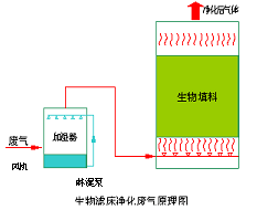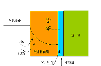 在適宜的環(huán)境條件下,附著于生物填料上的微生物利用廢氣中的污染物作為能源,維持生命活動(dòng),并將其分解為 CO 2 、 H 2 O 和其他無(wú)機(jī)鹽類(lèi),從而使廢氣得以?xún)艋?