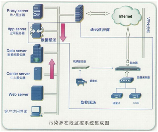 污染源在線監(jiān)測(cè)系統(tǒng)設(shè)備集成是一個(gè)以在線監(jiān)測(cè)分析儀器為核心,運(yùn)用自動(dòng)控制技術(shù)、計(jì)算機(jī)技術(shù)、網(wǎng)絡(luò)視頻技術(shù)并配以相應(yīng)的數(shù)據(jù)采集、數(shù)據(jù)傳輸軟件,組成一個(gè)從取水樣、預(yù)處理過濾、分析測(cè)量到數(shù)據(jù)處理、存儲(chǔ)、上報(bào)的系統(tǒng),從而實(shí)現(xiàn)污染源在線自動(dòng)監(jiān)測(cè)。