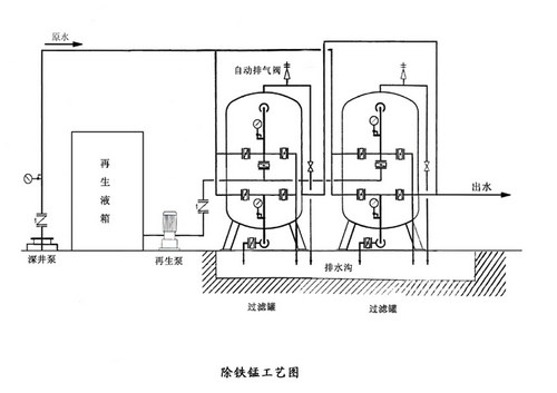 一般地下水中的鐵通常以二價鐵離子形態(tài)存在。經(jīng)過曝氣使二價鐵、錳被氧化成高價鐵、錳離子,形成不溶于水的氫氧化物,再通過過濾去除,達(dá)到國家飲用水的標(biāo)準(zhǔn)。