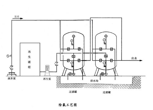 2)再生:該供水站每天供水約150T,150T水含氟總量為2.8(mg)×1000(L)×150(T)=420克,F(xiàn).F每除氟能量為1g/kg,去除420克需F.F0.42T。因運行罐為3只,用料2.7噸,運行6.4天需再生,考慮循環(huán)再生時間20h,設(shè)計再生周期4天較為適合。再生液為4%硫酸鋁鉀。