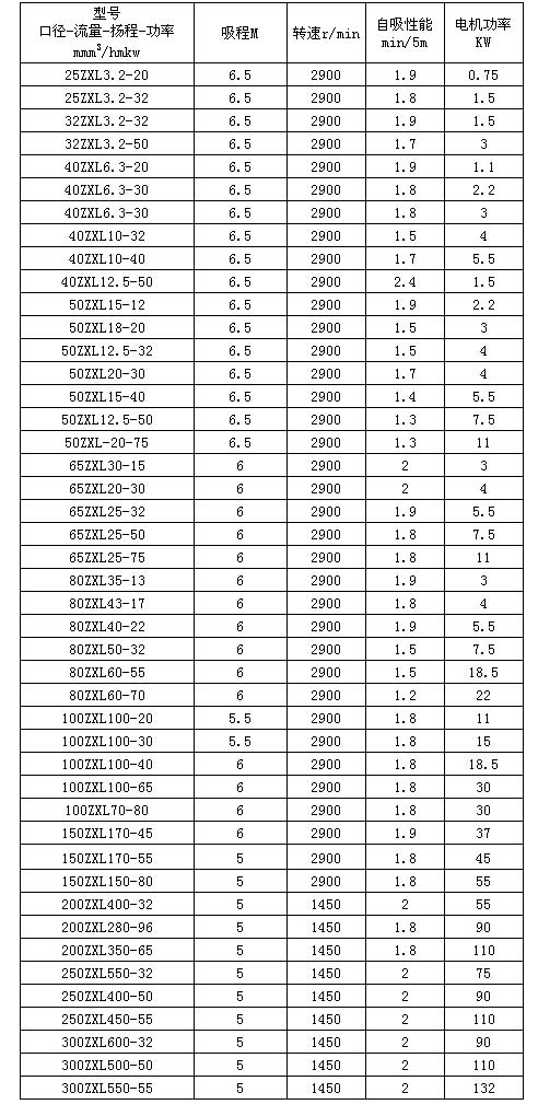 ZXL型自吸泵性能參數(shù)表: