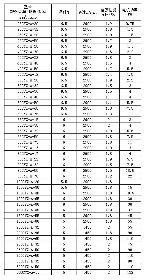 CYZ-A型自吸式離心油泵性能參數(shù)表:
