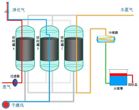 整個工藝流程如圖所示,三個吸附罐共用一個管路系統(tǒng),運行時相互切換。當A吸附罐吸附時,B吸附罐解吸,C吸附罐再生。當有機廢氣進入吸附罐,其中的有機物穿過顆粒活性炭后被吸附下來,凈化后的氣體由吸附罐頂部排出。A、B、C三個吸附罐交替切換。系統(tǒng)采用水蒸汽為脫附劑,脫附蒸汽由吸附罐頂部進入,穿過顆;钚蕴浚瑢⒈晃綕饪s的有機物脫附出來并帶入冷凝罐,經(jīng)過冷凝,有機物和水蒸汽的混合物被冷凝下來流入分層槽,通過重力沉降分離,達到回收有機物的目的。分離后的水排放至廠方化學污水系統(tǒng)集中處理后排放。系統(tǒng)運行過程中所有的動作切換,均由自動控制系統(tǒng)完成。