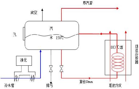灤南鵬程實(shí)業(yè)公司煉鐵廠共有四個(gè)450立方的高爐,用于冷卻煙罩的余熱鍋爐用水量5噸/小時(shí),因煙氣溫度在1000多度,用水冷卻時(shí)通過(guò)發(fā)生蒸汽來(lái)保護(hù)爐罩溫度降至700度以下,以保證煙罩的安全,見(jiàn)流程圖