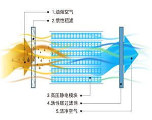 均衡慣性碰撞分離,去除粗大油煙顆粒,均化氣流,穩(wěn)定風速,提高整體凈化效率。