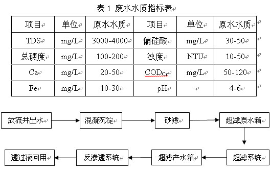 試驗(yàn)的廢水為經(jīng)物化、多級(jí)生化處理后的排放水,造紙廢水含有較多懸浮物(包括無(wú)機(jī)物和有機(jī)物),濁度高,硬度高,鐵含量高,水質(zhì)變化較大,水質(zhì)指標(biāo)見表1。為減輕膜污染,減少清洗難度和頻率,應(yīng)加強(qiáng)膜分離前的預(yù)處理,宜增加絮凝沉淀和常規(guī)過(guò)濾等預(yù)處理。本項(xiàng)目主要分成三部分:預(yù)處理(混凝沉淀、砂濾)、超濾、反滲透。