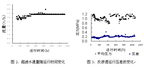 本項(xiàng)目已成功運(yùn)行一年半,膜通量在平均每月清洗一次的頻率下,保持穩(wěn)定的運(yùn)行通量,超濾產(chǎn)水率維持在25 L/m2•h,反滲透運(yùn)行產(chǎn)水量保持在25 L/m2•h。采用膜法回用的水質(zhì):pH為5~6,電導(dǎo)率25~40μs/cm,TDS15-25mg/L,總硬度2~4mg/L,達(dá)到該廠鍋爐用水標(biāo)準(zhǔn),既節(jié)約了取水費(fèi),又減少了近70%的排放量,運(yùn)行成本比直接從河水取水再凈化的系統(tǒng)經(jīng)濟(jì)許多,回用水質(zhì)得到保證,有利于提高產(chǎn)品質(zhì)量和檔次,同時(shí)將廢水中近35-40℃水溫的余熱進(jìn)行回收,降低生產(chǎn)成本,提高企業(yè)產(chǎn)品在國(guó)內(nèi)外市場(chǎng)競(jìng)爭(zhēng)力。