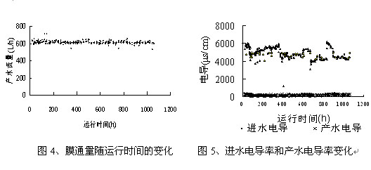 圖4看到在運(yùn)行期間反滲透膜平均通量達(dá)到24.79L/m2•h,最高可達(dá)到28.6 L/m2•h,并且流量比較平穩(wěn),沒有比較大的衰減。由圖5可以看出,反滲透產(chǎn)水電導(dǎo)率在150μs/cm,達(dá)到了用戶自來(lái)水的標(biāo)準(zhǔn);平均脫鹽率達(dá)到了97%;反滲透水回收率達(dá)到了75%。采用超濾膜和反滲透膜處理放流水試驗(yàn),結(jié)果表明經(jīng)過(guò)處理的放流水再經(jīng)膜法處理運(yùn)行相當(dāng)穩(wěn)定,反滲透透過(guò)液比工業(yè)給水清澈,含鹽量也低,并可以回用于紙機(jī)各條生產(chǎn)線中。