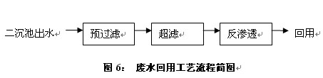 造紙廢水一般含懸浮物較多,碎的纖維狀懸浮物極易堵塞微濾及更細(xì)的膜。為避免廢水污物堵塞膜,減少清洗難度和頻率,在工程項(xiàng)目應(yīng)用中嚴(yán)格控制進(jìn)水的懸浮物量,通常采用常規(guī)物化和生化處理的二沉池出水作為膜法處理工藝的進(jìn)料液,放流水水質(zhì):pH為7~8,COD在80--150mg/L左右,SS為20~50mg/L,已達(dá)到國(guó)家一級(jí)排放標(biāo)準(zhǔn)。放流水經(jīng)預(yù)過(guò)濾后才能安全進(jìn)入膜法處理系統(tǒng)。超濾結(jié)合反滲透膜造紙廢水回用工藝已成功應(yīng)用于江蘇某紙業(yè)公司20000 m3/d放流水回用系統(tǒng)一期工程中。工藝流程如圖6所示。