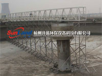 刮泥機(jī)由鋼梁走橋橫跨在沉淀池上,以池體走道為軌道,中心支座為軸,沿圓周運(yùn)轉(zhuǎn),進(jìn)行刮泥。其鋼梁形式分為半橋式和全橋式,它由端梁、驅(qū)動裝置、導(dǎo)(穩(wěn))流桶、中心支座、供電裝置、鋼梁走橋、桁架片、刮泥板、浮渣刮板、三角出水堰板、浮渣斗等部件組成。為了運(yùn)行平穩(wěn),刮泥機(jī)行走車輪采用鑄鋼輪芯與壓配式耐磨耐酸橡膠輪胎的組合件。