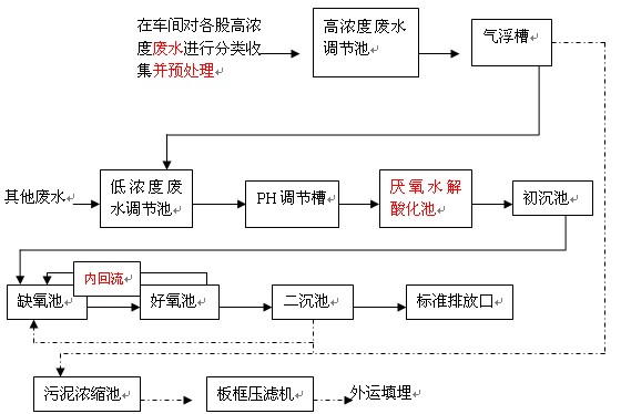 1, 高濃廢水在車間收集并預處理后用泵輸送到高濃度廢水調(diào)節(jié)池,調(diào)節(jié)PH,再用泵輸送到氣浮槽,進氣浮前投加絮凝劑,氣浮清水進入低濃度廢水調(diào)節(jié)池,浮渣進入污泥濃縮池。