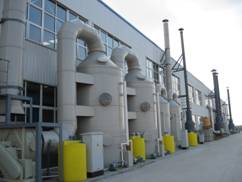 青島成霖集團(tuán)廠區(qū)有五個生產(chǎn)車間,其中重力鑄造車間、砂芯作業(yè)區(qū)、銅棒引鑄區(qū)和拋光車間主要產(chǎn)生粉塵,一級處理區(qū)產(chǎn)生硝酸霧和鉻酸霧。針對各車間產(chǎn)生的氣體特點(diǎn),五個車間均采用濕式凈化器。重力鑄造車間、砂芯作業(yè)區(qū)、銅棒引鑄區(qū)和拋光車間產(chǎn)生的廢氣由各自的吸風(fēng)罩收集到凈化器中,廢氣與噴淋水充分接觸,粉塵被溶于水中,在沉淀池中沉淀下來,凈化后的氣體經(jīng)除霧器排放到大氣中。對于一級處理區(qū)產(chǎn)生的硝酸霧,通過加入氫氧化鈉和次氯酸鈉,與之發(fā)生化學(xué)反應(yīng),達(dá)到去除硝酸霧的目的,由于反應(yīng)后產(chǎn)物的不穩(wěn)定性,考慮到廢氣能夠安全達(dá)標(biāo)排放,加兩級反應(yīng);硝酸霧具有腐蝕性,使凈化設(shè)備在負(fù)壓狀態(tài)下運(yùn)行,故把引風(fēng)機(jī)放在凈化器的后面,然后排放到大氣中。