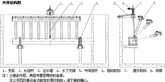 旋轉(zhuǎn)式撇水器通過驅(qū)動裝置和四連桿機構(gòu)將絲杠的直線升、降運動轉(zhuǎn)換成出水堰及排水支管的旋轉(zhuǎn)運動, 以撇除上清液。與此同時液面隨之同步下降,浮筒擋渣裝置在堰口前方的水上、水下,和兩側(cè)形成一個無浮渣的出水區(qū)域,浮筒漂浮于水面可以自動調(diào)節(jié)與堰口之間的距離。