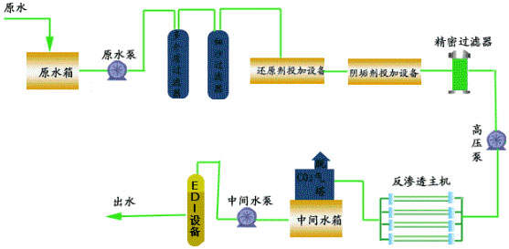 ●預(yù)處理-二級反滲透-中間水箱-水泵-EDI裝置-純化水箱-純水泵-紫外線殺菌器-精制混床-0.2或0.5μm精密過濾器-用水對象(最新工藝)