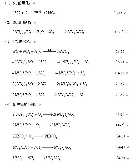 反應(yīng)式(3-3)和(3-4)由于NO難溶于液相而難以實(shí)現(xiàn),因此本技術(shù)的關(guān)鍵是NO到NO2的催化氧化,反應(yīng)要消耗液氨,產(chǎn)物為氮?dú)夂透碑a(chǎn)物硫酸銨、硝酸銨。此技術(shù)的核心是液相NO催化氧化催化劑的開發(fā),通過與氨法煙氣脫硫技術(shù)相結(jié)合,僅在脫硫吸收塔上設(shè)置一段脫硝段便可達(dá)到50%以上的脫硝效率(大于SNCR的脫硝率),使氨法脫硫與脫硝技術(shù)一體化,投資及運(yùn)行成本大幅度降低。此技術(shù)符合國家脫硝技術(shù)導(dǎo)則方向,即在低NOx燃燒器的基礎(chǔ)上,適當(dāng)配合其它脫硝技術(shù)達(dá)到減排NOx的目標(biāo)。