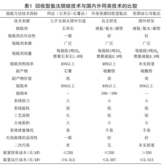 資源回收型氨法脫硫技術(shù)在技術(shù)性能、經(jīng)濟(jì)指標(biāo)和運(yùn)行效果等方面達(dá)到了國際先進(jìn)水平,與國內(nèi)外鈣法相比,優(yōu)勢更加明顯。詳見表1。
