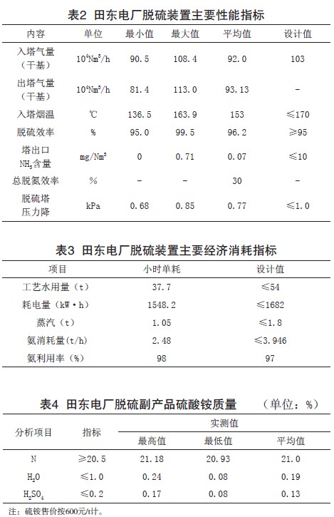 田東電廠脫硫工程168小時考核的技術(shù)性能指標(biāo)見表2,工程經(jīng)濟(jì)消耗指標(biāo)見表3。