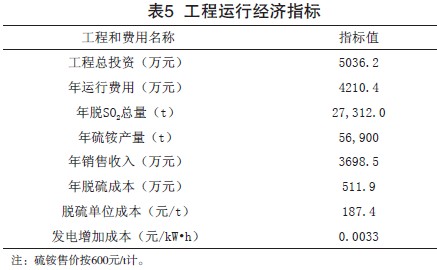 田東電廠脫硫工程的運(yùn)行經(jīng)濟(jì)指標(biāo)如表5所示,本項目的直接單位脫硫成本約為187.4元/噸SO2,折算到發(fā)電成本只增加了0.0033元/kW•h,經(jīng)濟(jì)效益顯著。