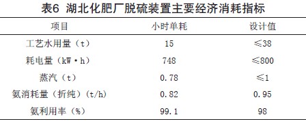 湖北化肥廠脫硫裝置的監(jiān)測報告顯示,該項目的脫硫效率為98.5%,同步脫硝效率也達(dá)到了55.2%,裝置的凈化性能較為突出。工程經(jīng)濟(jì)消耗指標(biāo)見表6,表中顯示所有消耗皆低于設(shè)計值。