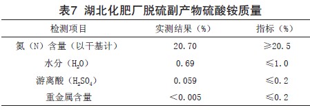 168小時考核期間,副產(chǎn)品硫酸銨的品質(zhì)委托湖北省宜昌市質(zhì)量監(jiān)督檢驗所檢測(結(jié)果見表7),檢測數(shù)據(jù)表明,副產(chǎn)硫酸銨完全達(dá)到了設(shè)計要求的GB535-1995 合格品標(biāo)準(zhǔn),重金屬含量也遠(yuǎn)低于GB/T23349-2009的限值要求,完全可作優(yōu)質(zhì)農(nóng)用肥使用。