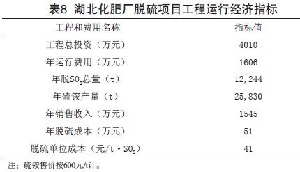 根據(jù)湖北省化肥行業(yè)的運(yùn)行數(shù)據(jù)測算,該項目的運(yùn)行經(jīng)濟(jì)結(jié)果(見表8)顯示,由于吸收劑為化工廠產(chǎn)的廢氨水,價格較低,本項目的直接單位脫硫成本只有41元/噸SO2,遠(yuǎn)低于630元/噸的排污費(fèi)用,經(jīng)濟(jì)效益十分顯著。