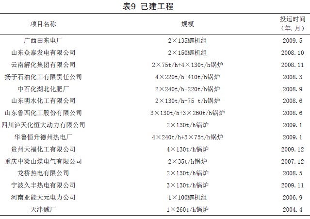 在建工程項目名稱及規(guī)模為:大唐能源化工有限責(zé)任公司8×470t/h鍋爐、山東濰坊鋼鐵集團(tuán)2×230m2燒結(jié)機(jī)、2×220t/h鍋爐、浙江巨化集團(tuán)2×410t/h鍋爐、貴州開陽化工有限責(zé)任公司5×150t/h鍋爐、四川天華股份有限公司3×220t/h+1×75t/h鍋爐、呼倫貝爾金新化工有限公司3×240t/h鍋爐、貴州金赤化工有限公司3×220t/h 鍋爐、山西盂縣化工有限公司4×75t/h鍋爐、貴州赤天化紙業(yè)有限公司2×75t/h鍋爐、山東魯南化肥廠1×260t/h和 2×130t/h鍋爐等。