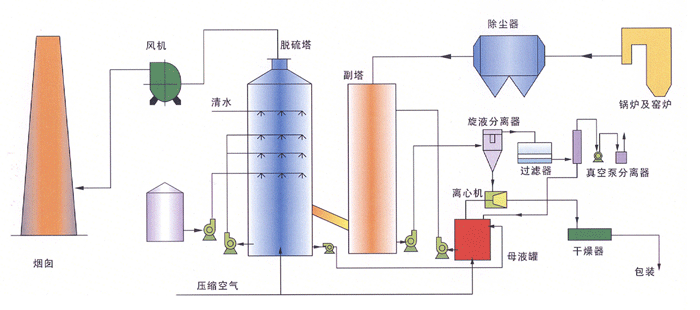 煙氣從現(xiàn)有的煙道進入脫硫塔。煙氣進入脫硫塔后,與包含氨水漿液的順流噴漿接觸。其中的S02由氨水漿液吸收,同時包含在煙氣中的飛灰含量將被維持在150mg/m3以下。漿液同時使氣體飽和,并將其從入口的l40℃溫度冷卻到50℃,緊接著氣體穿過脫硫塔兩個波紋型除霧器,去除氣體中的液滴,為減少化學作用、硫酸氨成品的損失及蒸發(fā)量,用清水來沖洗除霧器。運行的噴霧塔中的氣體,離開脫硫塔,通過加熱器加熱氣體,并以80℃的溫度、按設計的操作條件進入現(xiàn)有的煙囪裝置。