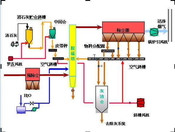 系統(tǒng)主要由消石灰貯存輸送、循環(huán)流化床吸收塔、噴水增濕、除塵器、除塵器收灰循環(huán)、脫硫渣輸送、以及儀表控制等子系統(tǒng)組成。