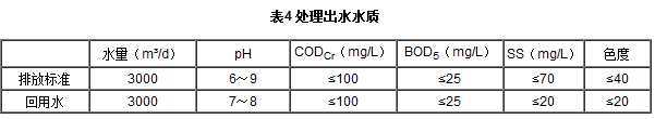處理后的出水水質(zhì)達到國家標準GB4287-92《紡織染整工業(yè)水污染物排放標準》的一級標準;赜盟|(zhì)達到廠方對回用水的要求。具體指標見表4。