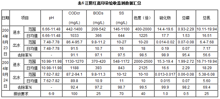 現(xiàn)將江蘇省環(huán)境監(jiān)測中心環(huán)境監(jiān)測站于2004年8月23日和24日驗收監(jiān)測數(shù)據(jù)匯總整理成表6,監(jiān)測時的廢水實際排放量約為1000t/d。