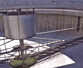 濃縮機(jī)由中心傳動(dòng)裝置驅(qū)動(dòng)傳動(dòng)軸、刮臂等旋轉(zhuǎn),刮臂上的刮板將污泥由池邊逐漸刮至池中心的泥坑中,通過(guò)排泥管排出池外;刮臂上固定有攪拌柵條,旋轉(zhuǎn)時(shí)提供絮狀污泥的沉淀空間,加速污泥的下沉,提供濃縮效果。