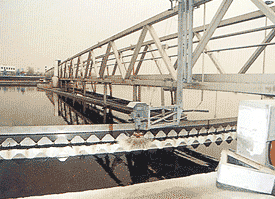驅(qū)動(dòng)裝置推動(dòng)工作橋沿池平面旋轉(zhuǎn),工作橋帶動(dòng)刮泥槽旋轉(zhuǎn),固定于泥槽上的排泥管在靜水壓力的作用下吸取池底污泥,通過泥量調(diào)節(jié)閥調(diào)節(jié),進(jìn)入排泥槽,排泥槽中的污泥流入中心泥缸中,排出池外;也可通過虹吸作用將泥從排泥槽吸入中心泥缸中。驅(qū)動(dòng)裝置可設(shè)扭矩保護(hù)裝置,工作更加安全。