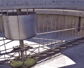 濃縮機由中心傳動裝置驅(qū)動傳動軸、刮臂等旋轉(zhuǎn),刮臂上的刮板將污泥由池邊逐漸刮至池中心的泥坑中,通過排泥管排出池外;刮臂上固定有攪拌柵條,旋轉(zhuǎn)時提供絮狀污泥的沉淀空間,加速污泥的下沉,提供濃縮效果。