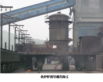 在爐頂出焦側(cè)位置上設(shè)置移動(dòng)通風(fēng)槽,支撐在焦?fàn)t立柱上;用于移動(dòng)通風(fēng)的通風(fēng)口裝置設(shè)置在導(dǎo)煙車上,與通風(fēng)槽上的皮帶配套,由導(dǎo)煙車帶動(dòng),不另外增加驅(qū)動(dòng)設(shè)備,將煙氣引出至除塵器;各導(dǎo)煙管分管上設(shè)有卸爆閥和手動(dòng)野風(fēng)閥,野風(fēng)閥用于手動(dòng)調(diào)節(jié)抽風(fēng)時(shí)混入空氣的混入量,保證煙氣中煤氣濃度在焦?fàn)t煤氣的安全范圍內(nèi),不發(fā)生爆炸,泄爆閥的作用則是在異常爆炸時(shí)的泄壓泄爆;匯總管上設(shè)放散管,一旦除塵系統(tǒng)故障時(shí)導(dǎo)煙小車可以對(duì)空排放。