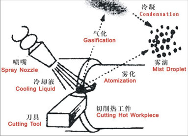 加工過程中金屬切削液油霧的形成的主要原因是霧化和蒸發(fā):霧化是機械能轉(zhuǎn)化為液滴表面能的過程,主要是由于液體對機床系統(tǒng)內(nèi)的固定及旋轉(zhuǎn)單元的激烈沖擊,被其打碎,形成細小液滴漂浮在工作環(huán)境中;蒸發(fā)的發(fā)生是由于切削區(qū)產(chǎn)生大量的熱量,這些熱量傳入切削液使它的溫度明顯高于飽和溫度,在固--液接觸面上就發(fā)生沸騰并產(chǎn)生蒸汽。這些蒸汽隨后與周圍空氣中的小液滴或其它粒子為核心凝結(jié) ,形成油霧 。