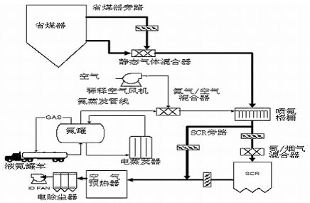 SCR工藝流程:還原劑(氨)用罐裝卡車運輸,以液體形態(tài)儲存于氨罐中;液態(tài)氨在注入SCR系統(tǒng)煙氣之前經(jīng)由蒸發(fā)器蒸發(fā)氣化;氣化的氨和稀釋空氣混合,通過噴氨格柵噴入SCR反應(yīng)器上游的煙氣中;充分混合后的還原劑和煙氣在SCR反應(yīng)器中反應(yīng),去除NOx。
