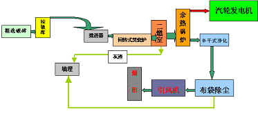 該工程總設(shè)計處理能力4×150t/d(20萬噸/年),總裝機容量12000kW,垃圾經(jīng)粗選破碎后送入回轉(zhuǎn)窯,在窯內(nèi)氣化熱解,氣化產(chǎn)物和殘渣在二燃室充分燃盡,殘渣經(jīng)固化處理后填埋,煙氣出鍋爐后,經(jīng)半干式脫硫及布袋除塵達到排放要求后排入大氣。系統(tǒng)示意如下圖: