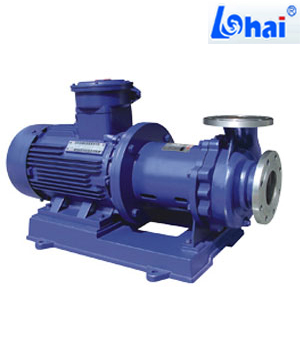 CQB磁力驅(qū)動(dòng)離心泵(簡(jiǎn)稱磁力泵),通常由電動(dòng)機(jī),磁力偶合器和耐腐蝕離心泵組成.其主要特點(diǎn)是利用磁力偶合器傳遞動(dòng)力,完全無(wú)泄漏,當(dāng)電動(dòng)機(jī)帶動(dòng)磁力偶合器的外磁鋼旋轉(zhuǎn)時(shí),磁力線穿過(guò)問(wèn)隙和隔離套,作用于內(nèi)磁鋼上,使磁力泵轉(zhuǎn)子與電動(dòng)機(jī)同步旋轉(zhuǎn),無(wú)機(jī)械接觸地傳遞扭矩.在泵軸的動(dòng)力輸入端,由于液體被封閉在靜止的隔離套內(nèi),沒(méi)有動(dòng)密封因而完全無(wú)泄漏.