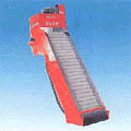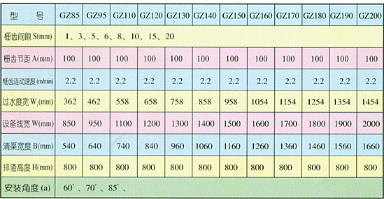 本除污機(jī)是由驅(qū)動(dòng)裝置、機(jī)架、鏈輪、鏈條、耙齒組成。由鏈條帶動(dòng)與鏈條相連的耙齒組成格柵。格柵不斷運(yùn)動(dòng),將截留物質(zhì)送到設(shè)備上部。當(dāng)格柵改變運(yùn)動(dòng)方向時(shí),使每組耙齒之間發(fā)生相對運(yùn)動(dòng),將大部分固體雜物分離出來,靠自重落下。另一部分粘在耙齒上的雜物依靠清洗機(jī)構(gòu)的橡膠刷作反向運(yùn)動(dòng)將其洗刷干凈。