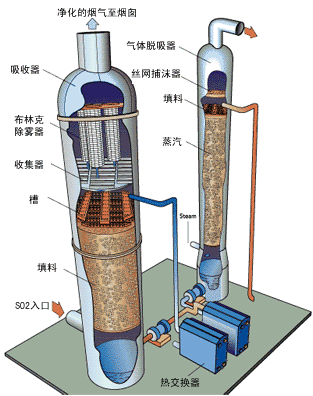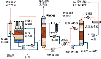含有H2S和SO2的尾氣從Claus 回收裝置排出,完全熱氧化或催化成二氧化硫。然后二氧化硫熱氣體在動(dòng)力波洗滌塔和煙氣冷卻塔冷卻,亞微粒酸霧用布林克除霧器除去。