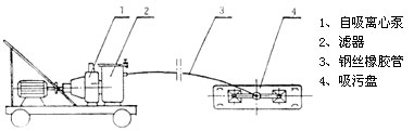 ①一臺(tái)自吸式手推吸污泵車,操作時(shí)移動(dòng)方便,并配用濾器,可濾掉池底雜物。