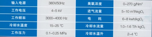 ●當臭氧發(fā)生器運行在濃度102g/m3(7%wt.)時達到額定臭氧產(chǎn)量10kg/h,每公斤臭氧的耗電量6.8kwh,耗氧量10Nm3,耗水量1.5m3.