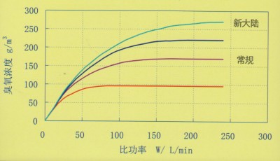 | 比功率曲線表示臭氧發(fā)生器在一定的電功率和氧氣流量下(比值表示)生成的臭氧產(chǎn)量,與常規(guī)臭氧發(fā)生器相比,新大陸臭氧發(fā)生器具有更高的比功率曲線和臭氧濃度。 |