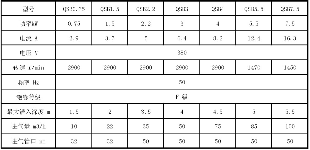 注:表中進(jìn)氣量及增氧能力是在標(biāo)準(zhǔn)試驗(yàn)條件下(20°C 水溫,氣壓 101.325kPa),曝氣機(jī)潛水深度3m,試驗(yàn)介質(zhì)為清水。在中度污水中,增氣能力可按系數(shù)0.85 作為設(shè)計(jì)依據(jù)。