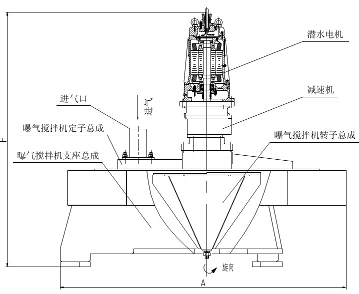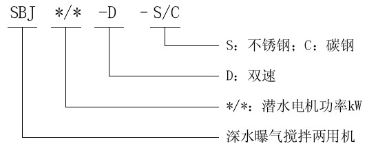 SBJ產(chǎn)品由潛水電機(jī)、減速裝置、葉輪、混合室、底座、輸氣管、起吊鏈組成。如圖